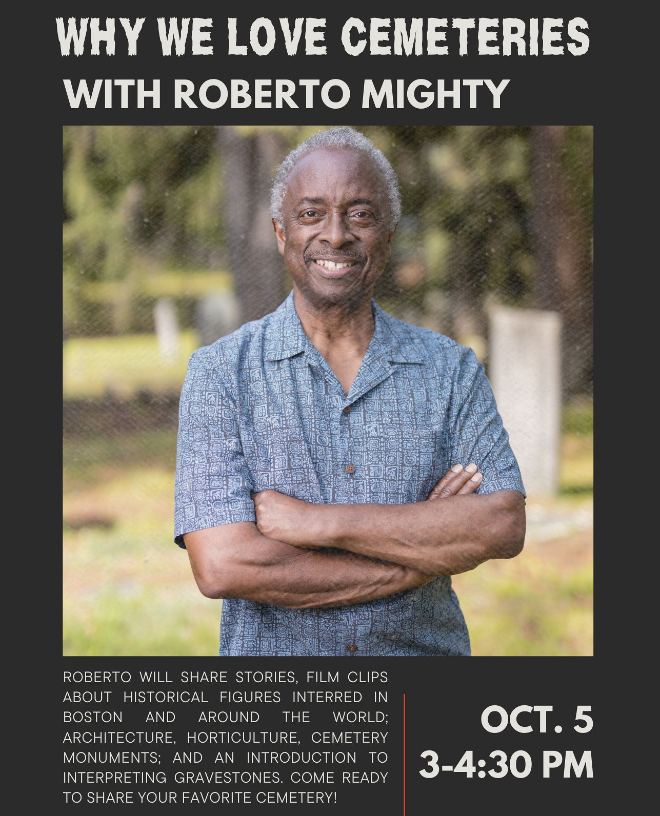 “It’s easy to say that our community here at Mission Hill absolutely enjoyed Roberto Mighty’s presentation on Why We Love Cemeteries. From history to horticulture, the audience learned a great deal as to the importance of cemeteries both for the dead and for the living. Roberto made this sometimes morbid topic into one of great interest through his enthusiasm to share what he’s learned with others. We’re so appreciative!” - Amy Layton, Boston Public Library, Parker Hill Branch